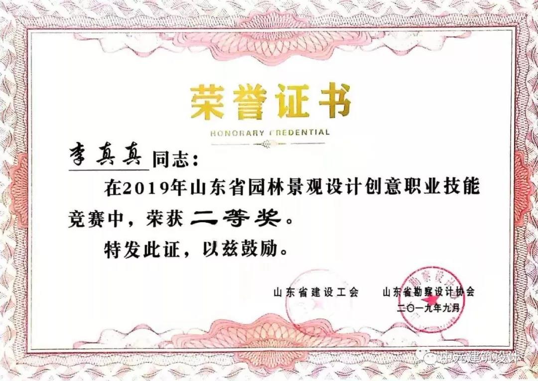 祝賀我公司李真真在2019年度山東省園林景觀設(shè)計(jì)創(chuàng)意職業(yè)技能競(jìng)賽中獲得全省二等獎(jiǎng)的驕人戰(zhàn)績(jī)。為公司和個(gè)人贏得榮譽(yù)。