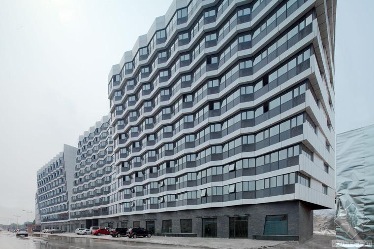 建筑的底層是展廳和商業(yè)。公寓部分在二層以上,大約占總建筑面積的三分之二,因分屬于三個投資人,業(yè)主希望從形式上有區(qū)分,突出各自的獨立性。我們以公寓面寬為基準定義出一個標準戶型的外觀形式,在南立面上進行重復,通過基本單元有序的懸挑形成錯動,發(fā)展出水平和垂直方向富有動感的體量變化,進而強調出辦公和兩部分公寓的清晰分界。于是集合體明確地呈現(xiàn)出四部分,一個底座和上面三個起伏的體塊,為內容的不同提供了明顯的標識。