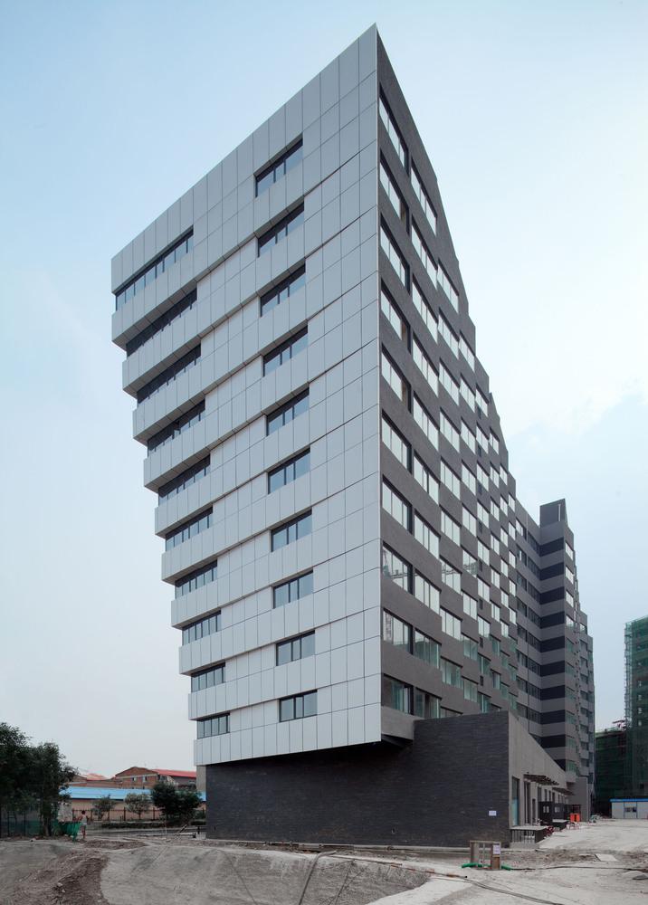 隨著過去十來年中國當代藝術的升溫,年輕藝術家和各種與藝術相關的產業(yè)近幾年不斷涌入宋莊。當?shù)卦鷳B(tài)村民的小院除了農民自住以外,大部分已被租賃,并呈現(xiàn)短缺。原生態(tài)村落、藝術家、藝術產業(yè)和自由小商業(yè)之間的相互碰撞,以及外來人口的膨脹不可避免地帶來建筑密度的增加。在這種情形下,中小面積的公寓、工作室、展廳和小商業(yè)的集合體成為一種自然生長出來的、適合當?shù)匦枨蟮慕ㄔO模式。與政府統(tǒng)一開發(fā)不同,宋莊特定的地域文化特征使得一棟建筑的建造通常由幾方集資,建成后共同經營。東潤公寓就是這樣一個集合體,它的設計體現(xiàn)出建筑的內在成因和經營模式,是對當?shù)靥囟ㄎ幕h(huán)境的映射。它位于宋莊最主要道路一側,十字環(huán)島的東北角?;貣|西長110米,南北進深20米。