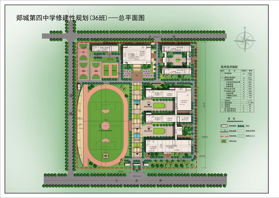 學校位于郯城縣,學??偨ㄖ娣e為27950平方米,設計人員根據(jù)功能把不同功能的建筑物放到不同區(qū)域,然后再把不同單體安照建筑美學重新排列,總共分成4個區(qū)域。每個區(qū)域排列著相應單體,教學區(qū)域排列兩棟教學樓和一座科技實驗綜合樓,三個單體之間用連廊鏈接。生活區(qū)把男女宿舍樓放在最東邊,并把教師周轉房放到西邊,在男女宿舍樓與教師周轉房之間放一座綜合樓,這樣綜合樓面對大門口,使得之間的開拓出來一條知識長廊大道。讓進入學校后感受到進入到了知識的海洋。最西邊活動區(qū)排列了操場及籃球場。讓學生們在課余時間能有足夠的活動空間。