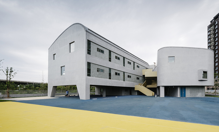 北側(cè)的城市界面較為齊整但不失活躍,幼兒園的圍墻沒有完全貼合紅線,而是向內(nèi)設(shè)置了多處轉(zhuǎn)折,在步行道旁留出了駐足的空間,在入口處后退,留出了家長等候的場地。同時(shí)將部分綠地讓出給城市界面共享,以減少對(duì)街道的壓迫。圍墻不僅僅是出于安全要求的設(shè)計(jì),更是建筑與街道之間的緩沖,在低視角處增加了步行空間的樂趣,形成積極的連續(xù)界面。而在高視角的建筑界面,將日常中容易被忽視卻頻繁使用的樓梯間,作為獨(dú)立的語匯提取出來,在北側(cè)界面穿插進(jìn)不同顏色和尺度的體量,也讓南側(cè)活動(dòng)室之間的空間更緊湊。盡端以一個(gè)多功能廳的弧形輪廓收尾,自然緩和的過渡到室外的活動(dòng)場地。北側(cè)界面在高低有序、材料統(tǒng)一的前提下,調(diào)節(jié)街道面的節(jié)奏感,避免狹窄的場地中連續(xù)體量帶來的緊張感。在高層住宅林立的背景前,留給行人和幼兒一個(gè)親和的街道面,將幼兒園內(nèi)部的溫馨環(huán)境和適宜尺度,也延續(xù)至立面和街道。
