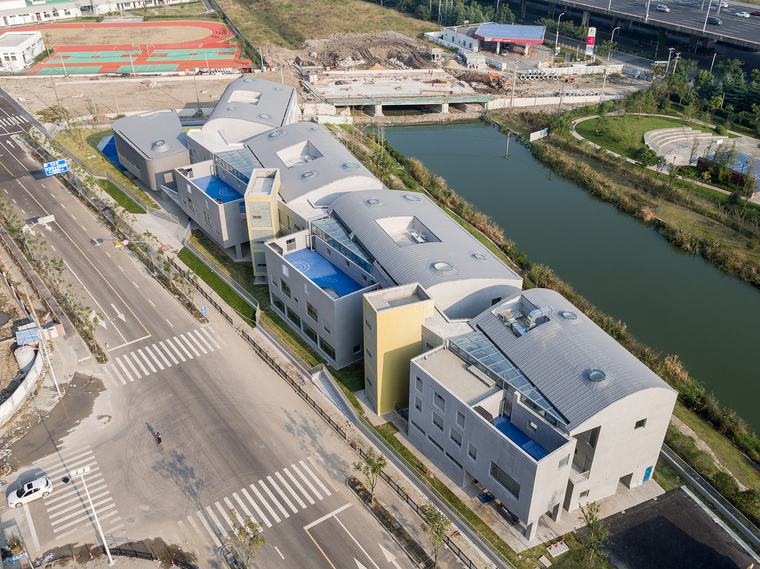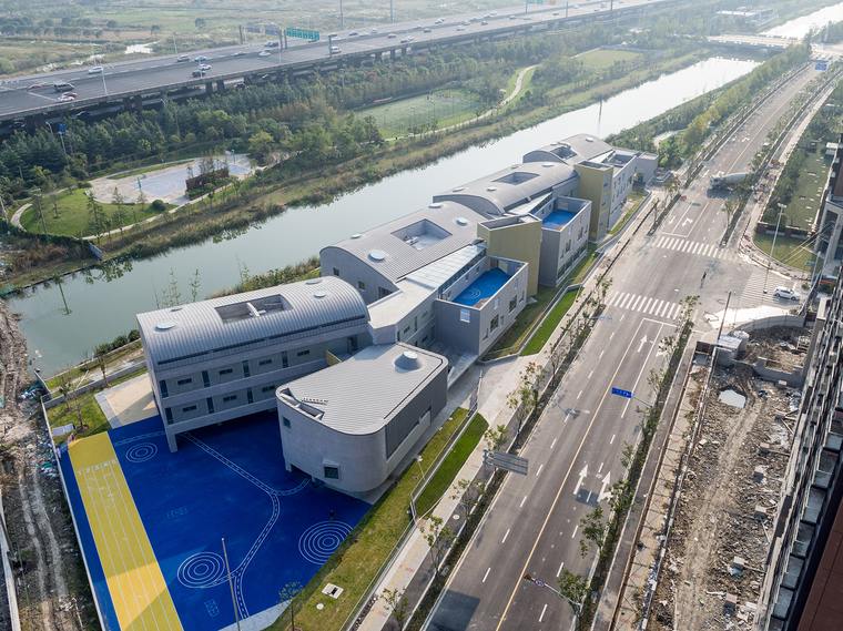 幼兒園是孩子們在成長過程中第一個(gè)接觸的公共空間。空間的尺度、使用的靈活度以及室內(nèi)的場景和氛圍,對(duì)于幼兒的感受和認(rèn)知都有很大影響,對(duì)于建筑師也是一個(gè)挑戰(zhàn)。設(shè)計(jì)要能激發(fā)孩子們探索和學(xué)習(xí)的興趣,同時(shí)要給他們足夠的安全感,要有家的感覺。在調(diào)研期間,設(shè)計(jì)團(tuán)隊(duì)也發(fā)現(xiàn),非正式空間-如活動(dòng)室前的走廊-往往是孩子們生活、交往、嬉戲的重要場所。功能、空間與環(huán)境的關(guān)系,是本案在設(shè)計(jì)初始所面臨的主要矛盾和核心議題。張江萬科實(shí)驗(yàn)幼兒園位于一個(gè)狹長的三角形地塊。基地南側(cè)為中環(huán)路高架與河道綠化,北側(cè)為高層住宅區(qū),東側(cè)為一座跨河道的車行橋,西側(cè)則為一棟需要容納在場地內(nèi)的區(qū)域環(huán)網(wǎng)站。要做出一個(gè)回應(yīng)場地限制條件并符合教育局規(guī)范標(biāo)準(zhǔn)的15個(gè)班全日制幼兒園,這塊特殊的基地便顯得極具挑戰(zhàn)性。建筑師需要在滿足規(guī)劃指標(biāo)、使用面積、規(guī)范性、安全性等硬性要求的前提下,在一個(gè)相對(duì)局促的場地里,創(chuàng)造出符合老師教學(xué)管理、誘發(fā)兒童探索心理、和滿足家長預(yù)期的幼兒園。