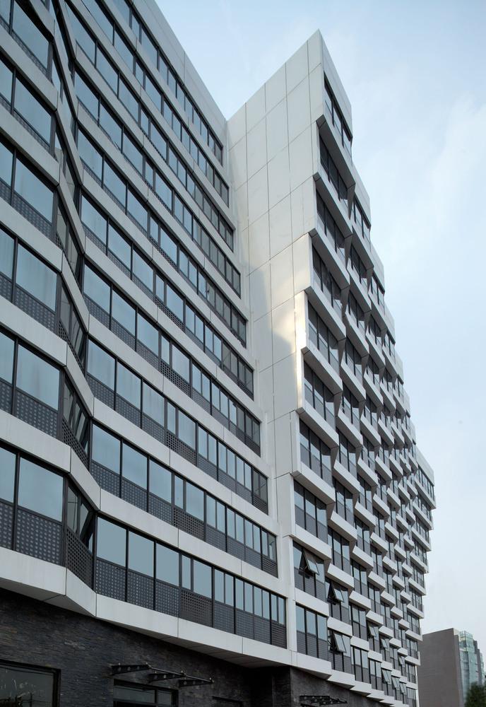 建筑的底層是展廳和商業(yè)。公寓部分在二層以上,大約占總建筑面積的三分之二,因分屬于三個投資人,業(yè)主希望從形式上有區(qū)分,突出各自的獨立性。我們以公寓面寬為基準定義出一個標準戶型的外觀形式,在南立面上進行重復,通過基本單元有序的懸挑形成錯動,發(fā)展出水平和垂直方向富有動感的體量變化,進而強調出辦公和兩部分公寓的清晰分界。于是集合體明確地呈現(xiàn)出四部分,一個底座和上面三個起伏的體塊,為內容的不同提供了明顯的標識。
