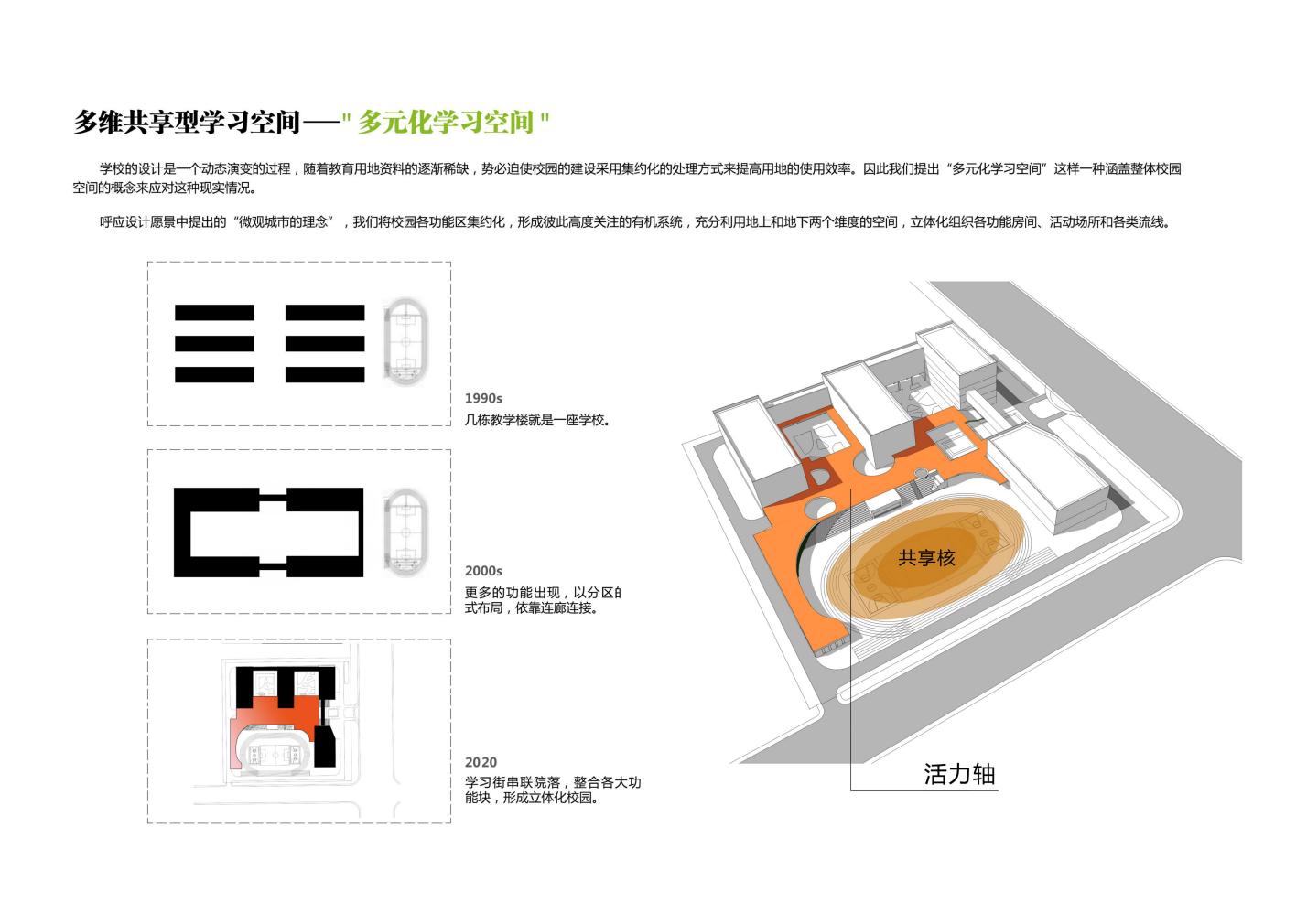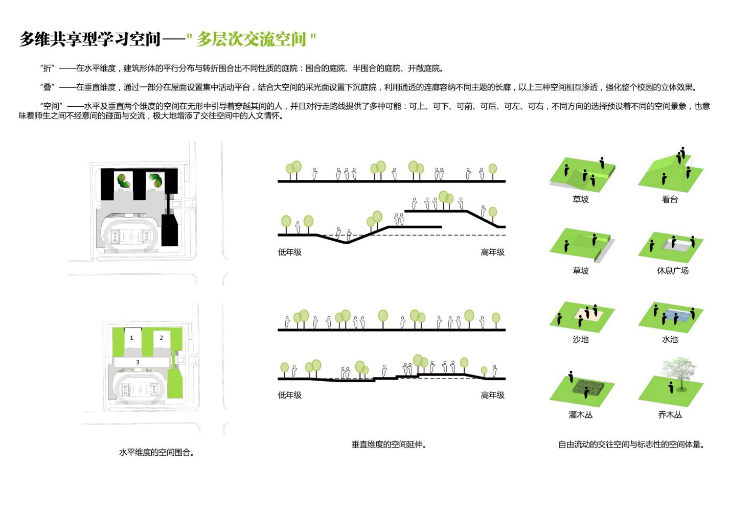 因本學(xué)校規(guī)模的班額較多,土地資源緊張,為了提高用地的使用效率,我們利用了地上以及地下的兩個空間,提出“雙首層”以及“雙地下”的概念,形成地上雙層以及地下雙層四個維度的空間,立體化的組織學(xué)校內(nèi)各功能房間,活動場所以及各類流線。